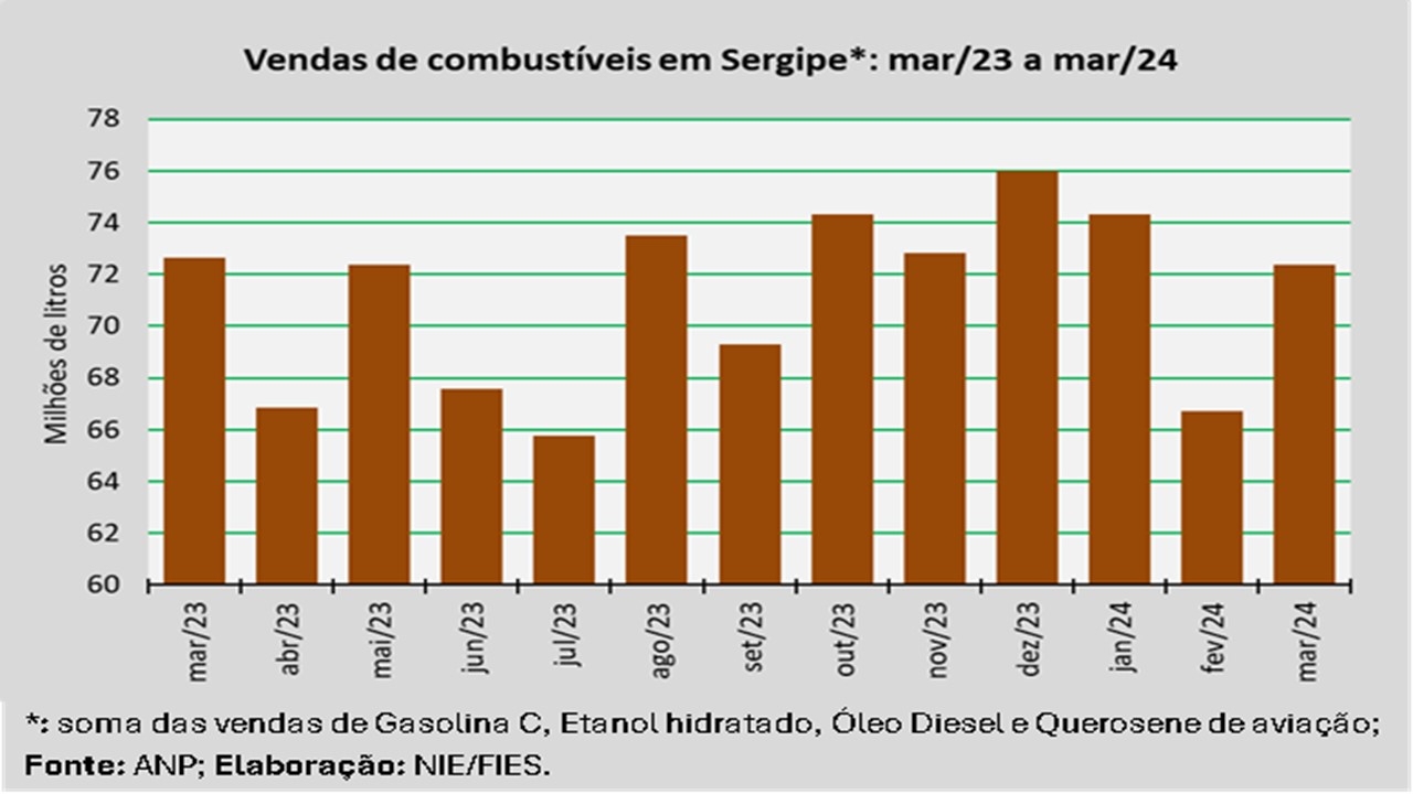 Análise realizada pelo Núcleo de Informações Econômicas da Federação das Indústrias do Estado de Sergipe (FIES), com base nos dados da Agência Nacional do Petróleo, Gás Natural e Biocombustíveis (ANP), indicou que as vendas totais de combustíveis em Sergipe, em março de 2024, totalizaram cerca de 72,4 milhões de litros, assinalando um decréscimo de 0,4% quando comparado a março de 2023. Em relação ao mês imediatamente anterior (fevereiro/2024), as vendas aumentaram 8,4%.