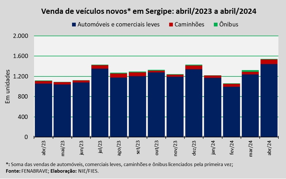 Análise realizada pelo Núcleo de Informações Econômicas (NIE) da Federação das Indústrias do Estado de Sergipe (FIES), com base nos dados da Federação Nacional da Distribuição de Veículos Automotores (FENABRAVE), apontou que as vendas de veículos novos no estado, no mês de abril, totalizaram 1.546 unidades.