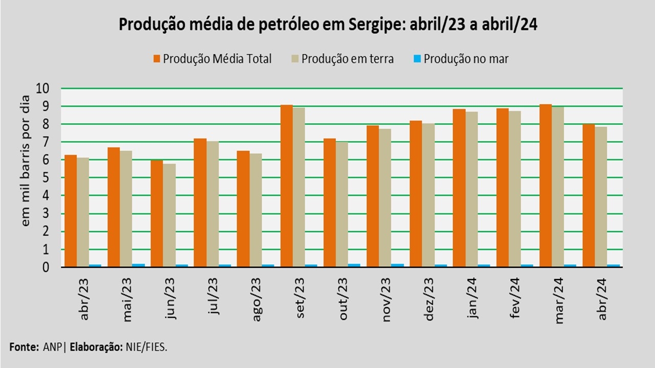 Análise realizada pelo Núcleo de Informações Econômicas da Federação das Indústrias do Estado de Sergipe (FIES), com base nos dados da Agência Nacional do Petróleo, Gás Natural e Biocombustíveis (ANP), revelou que a produção de petróleo no estado, no mês de abril, alcançou, em média, 8,0 mil barris por dia (bpd), registrando redução de 12,0% em relação à produção média do mês anterior (março/2024). No comparativo com abril de 2023, verificou-se acréscimo de 27,3%. Com o total produzido em abril, a produção acumulada ao longo de 2024 atingiu cerca de 34,8 mil barris, um crescimento de 60,2% no comparativo com o mesmo período de 2023.