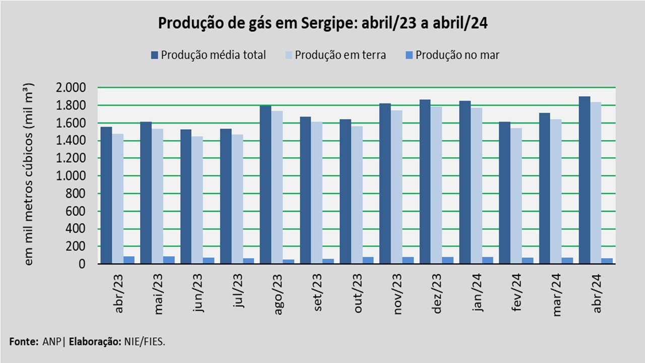 A produção em terra foi a principal fonte de produção de gás natural no estado, totalizando cerca de 1,83 milhão de metros cúbicos (m³), no período analisado. Esse volume correspondeu a 96,4% do total produzido no mês de abril, ao passo que a produção em mar foi de 68 mil metros cúbicos (m³), representando 3,6% da produção.