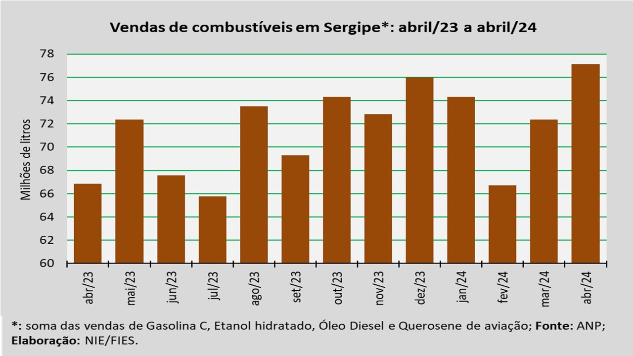 Análise realizada pelo Núcleo de Informações Econômicas da Federação das Indústrias do Estado de Sergipe (FIES), com base nos dados da Agência Nacional do Petróleo, Gás Natural e Biocombustíveis (ANP), indicou que as vendas totais de combustíveis em Sergipe, em abril de 2024, totalizaram 77,1 milhões de litros, assinalando um acréscimo de 15,4% quando comparado a abril de 2023. Em relação ao mês imediatamente anterior (março/2024), as vendas aumentaram 6,6%.