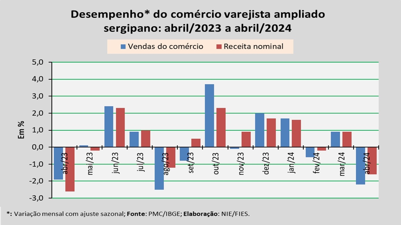 Análise realizada pelo Núcleo de Informações Econômicas da Federação das Indústrias do Estado de Sergipe (FIES), com base nos dados da Pesquisa Mensal do Comércio (PMC) do IBGE, apontou que as vendas do comércio varejista ampliado sergipano, em abril de 2024, assinalaram redução de 2,2%, em relação ao mês imediatamente anterior (março/2024), na série com ajuste sazonal (método que uniformiza os períodos de comparação). No comparativo com abril de 2023, observou-se acréscimo de 8,7%. Já no acumulado dos últimos doze meses, o crescimento registrado foi de 4,6%.