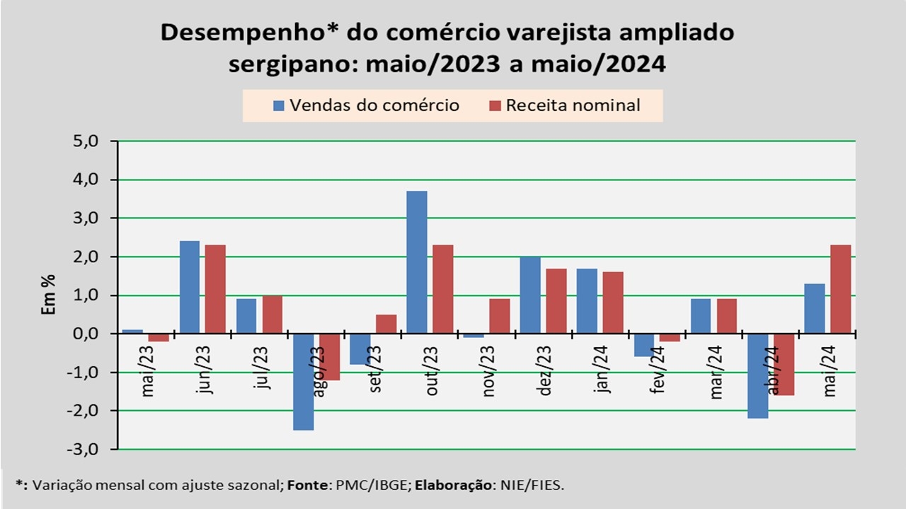 Análise realizada pelo Núcleo de Informações Econômicas da Federação das Indústrias do Estado de Sergipe (FIES), com base nos dados da Pesquisa Mensal do Comércio (PMC) do IBGE, apontou que as vendas do comércio varejista ampliado sergipano, em maio de 2024, assinalaram um crescimento de 1,3%, em relação ao mês imediatamente anterior (abril/2024), na série com ajuste sazonal (método que uniformiza os períodos de comparação). No comparativo com maio de 2023, observou-se acréscimo de 6,3%. Já no acumulado dos últimos doze meses, o crescimento registrado foi de 5,6%.