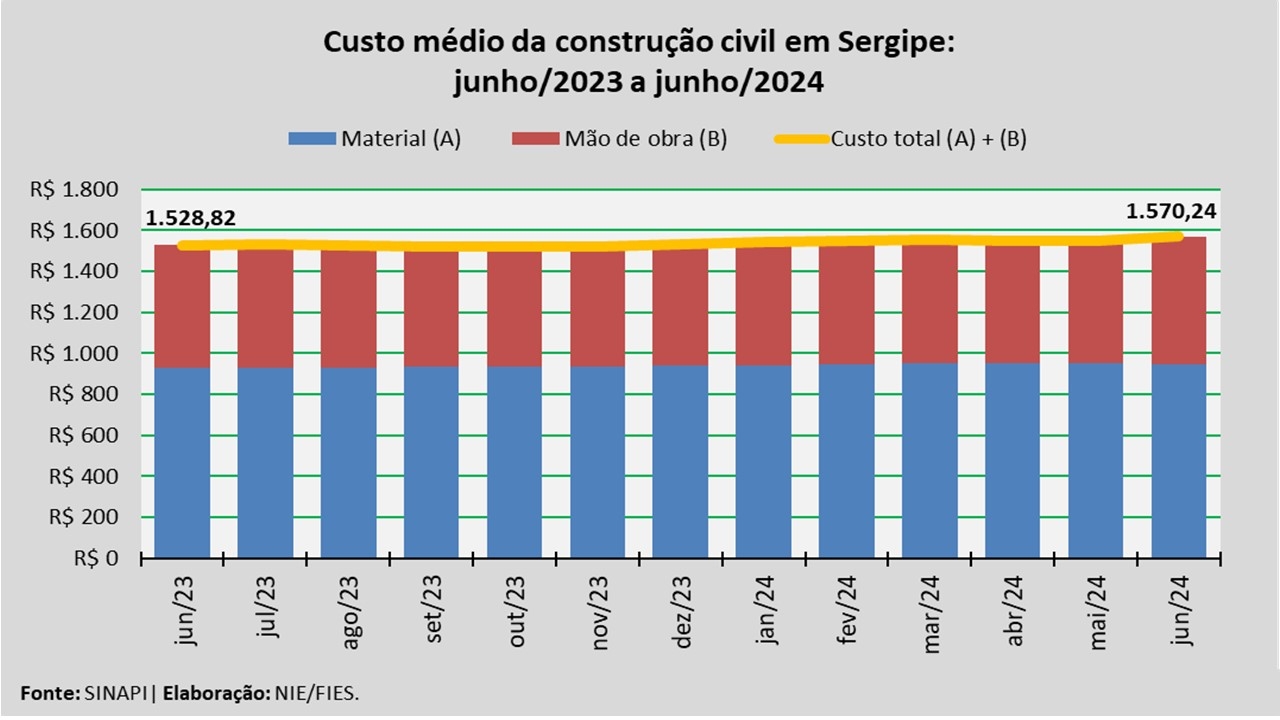 Análise realizada pelo Núcleo de Informações Econômicas da Federação das Indústrias do Estado de Sergipe (FIES), com base nos dados do Sistema Nacional de Pesquisa de Custos e Índices da Construção Civil – SINAPI, uma produção conjunta do IBGE e da Caixa Econômica Federal, revelou que o custo médio da construção em Sergipe, por metro quadrado (m²), em junho deste ano, registrou aumento de 1,3%, quando comparado com o mês imediatamente anterior, maio último. Na comparação com o mês de junho do ano passado, o custo registrado apresentou acréscimo de 2,7%.