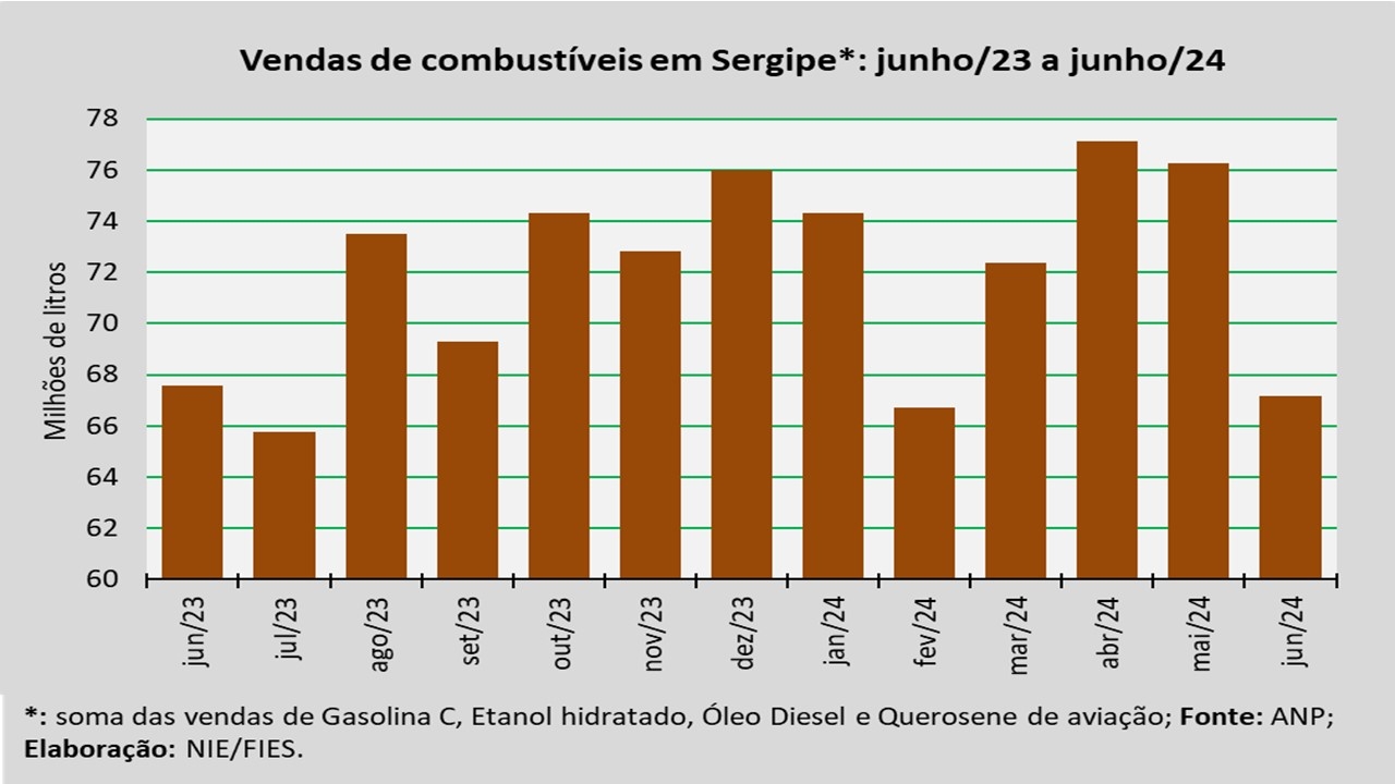 Análise realizada pelo Núcleo de Informações Econômicas da Federação das Indústrias do Estado de Sergipe (FIES), com base nos dados da Agência Nacional do Petróleo, Gás Natural e Biocombustíveis (ANP), indicou que as vendas totais de combustíveis em Sergipe, em junho de 2024, totalizaram cerca de 67,2 milhões de litros, assinalando um decréscimo de 0,6% quando comparado a junho de 2023. Em relação ao mês imediatamente anterior (maio/2024), as vendas reduziram 11,9%.