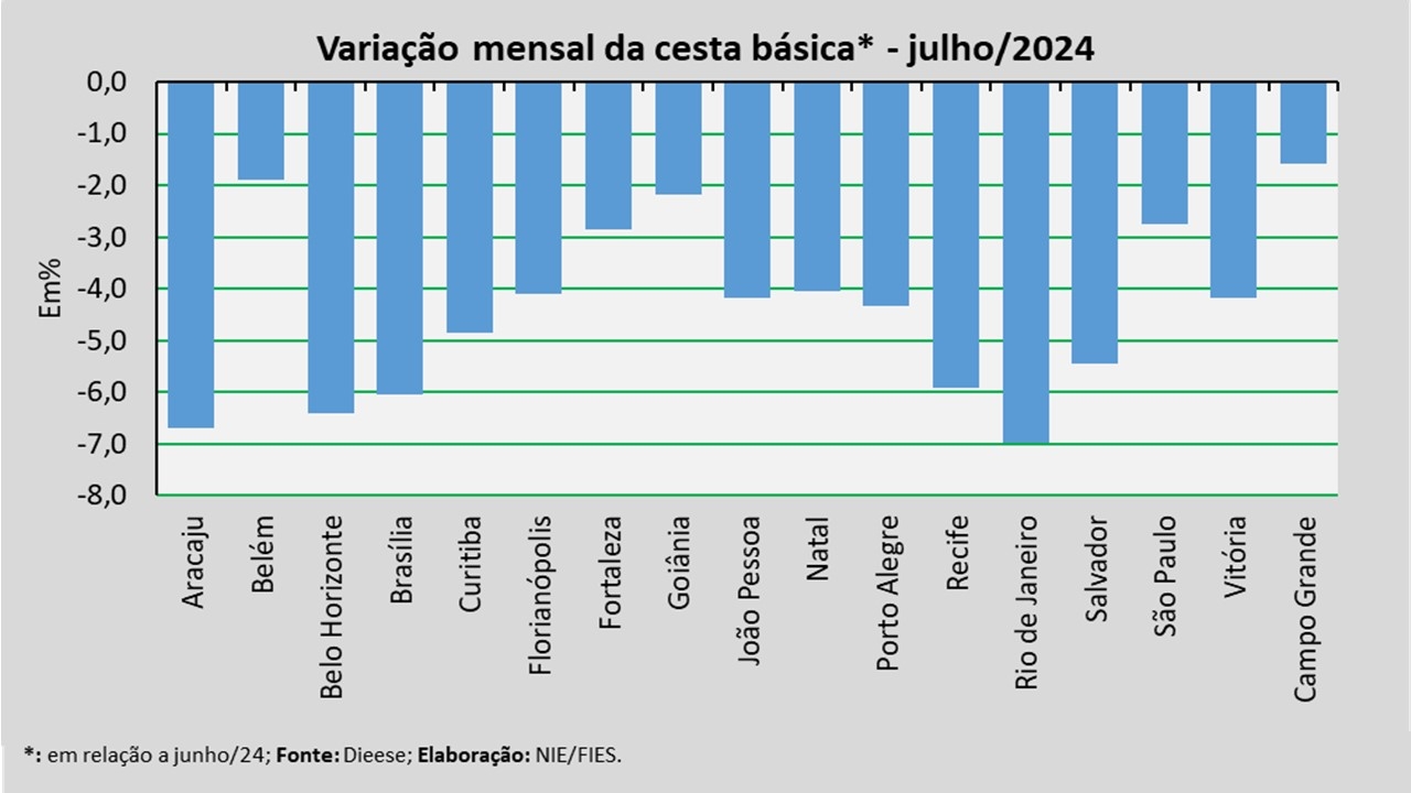 No mês analisado, levando-se em consideração a comparação com o mês anterior (junho/2024), observou-se redução no valor da cesta básica em todas as capitais pesquisadas, com destaque para o Rio de Janeiro (-6,97%), Aracaju (-6,71%) e Belo Horizonte (-6,39%).