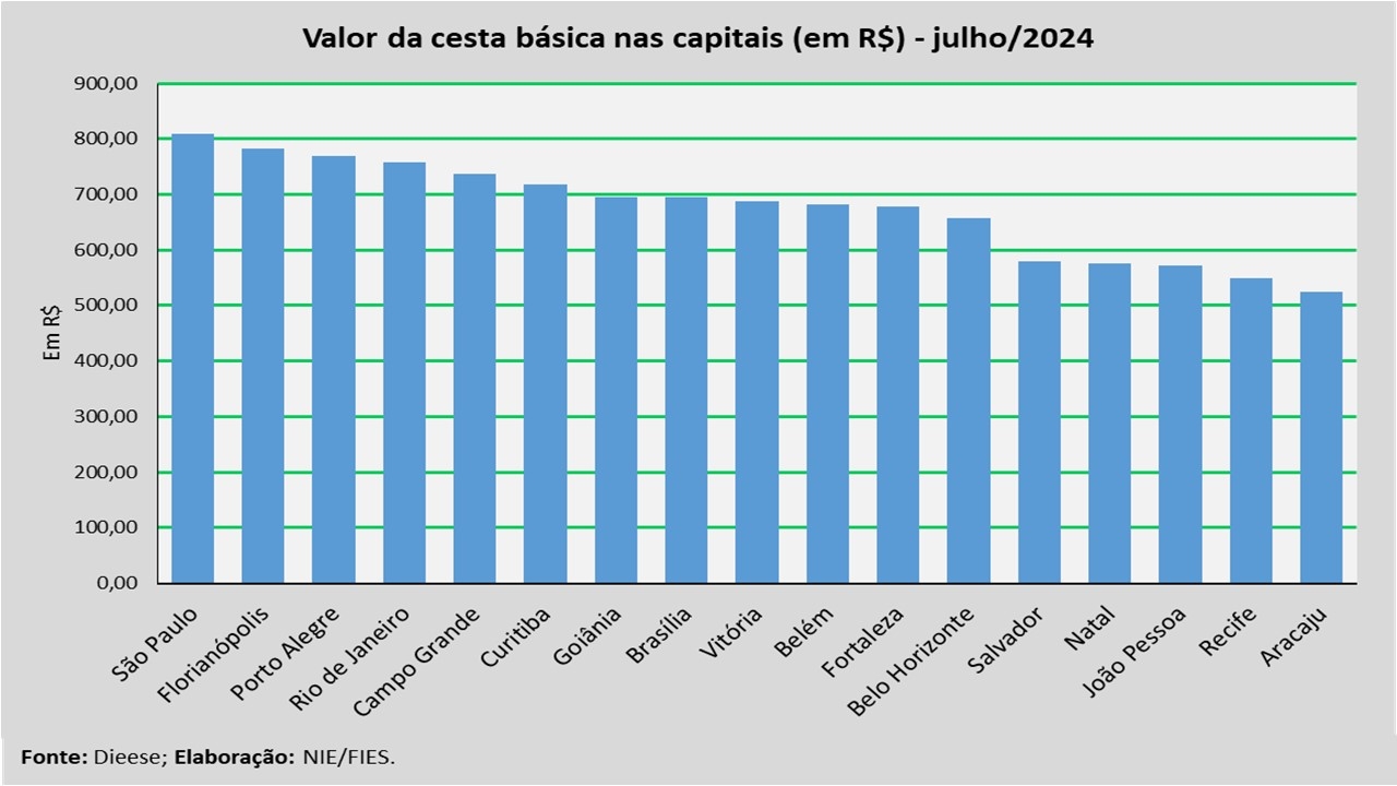 Em termos absolutos, a capital com a cesta mais cara, no mês analisado, foi São Paulo (R$ 809,77), seguida por Florianópolis (R$ 782,73) e Porto Alegre (R$ 769,96). Já as capitais com as cestas mais baratas foram Aracaju (R$ 524,28), seguida por Recife (R$ 548,43) e João Pessoa (R$ 572,38).
