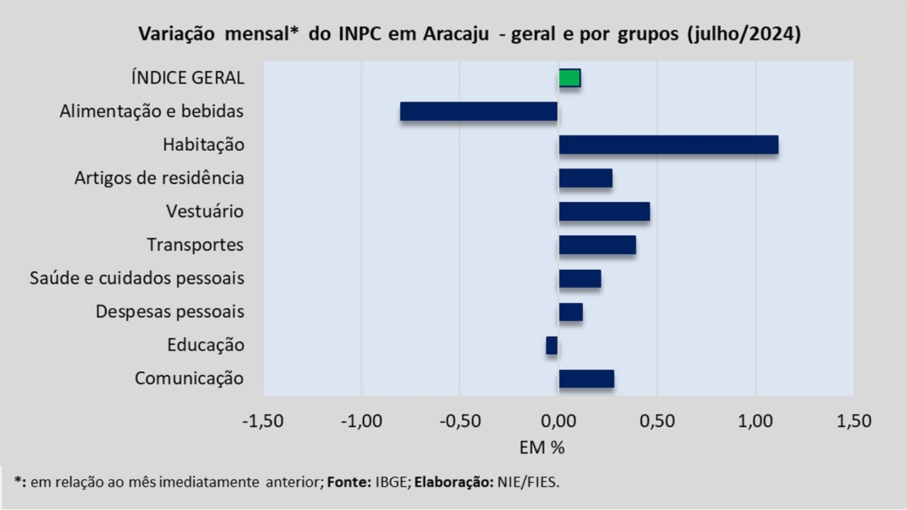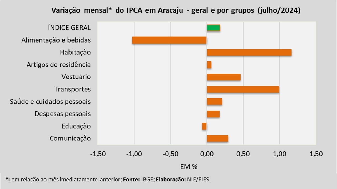 Em Aracaju, no período analisado, dos nove grupos de produtos e serviços pesquisados para medir o comportamento dos preços, dois apresentaram variação negativa de preço (deflação): Alimentação e bebidas (-1,02%) e Educação (-0,06%).