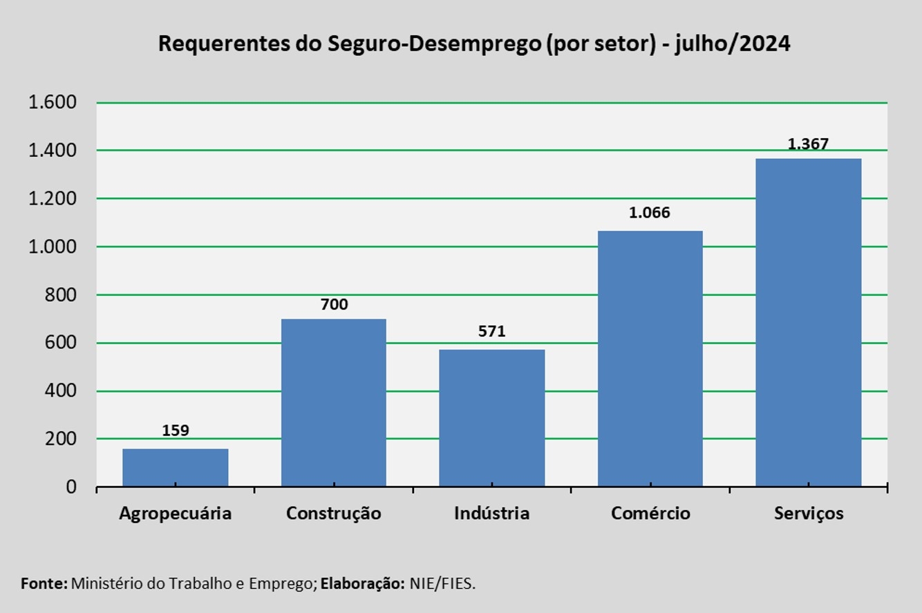 A análise dos dados revelou ainda que os pedidos realizados no sétimo mês de 2024 se concentraram principalmente no setor de Serviços (1.367 requerentes ou 30,8% do total), seguido de Comércio, com 24,0% (1.066 requerentes), da Construção, com 15,8% (700 requerentes), da Indústria, com 12,9% (571 requerentes), e da Agropecuária, com 3,6% (159 requerentes), do total de solicitações.
