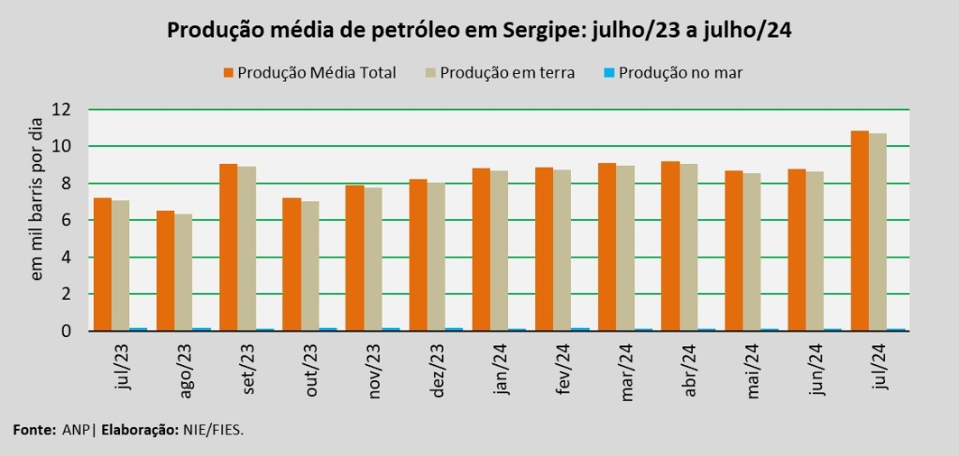 Já a produção no mar chegou, em média, a 135,4 barris por dia (bpd), abrangendo 1,2% da produção total. Em termos comparativos, verificou-se decréscimo de 5,1% em relação a junho último. Na comparação com julho de 2023, observou-se retração de 15,5%. ![]()