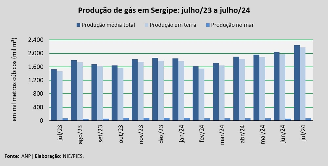 A produção em terra foi a principal fonte de produção de gás natural no estado, totalizando cerca de 2,18 milhões de metros cúbicos (m³), no período analisado. Esse volume correspondeu a 97,0% do total produzido no mês de julho, ao passo que a produção em mar foi de 68 mil metros cúbicos (m³), representando 3,0% da produção.