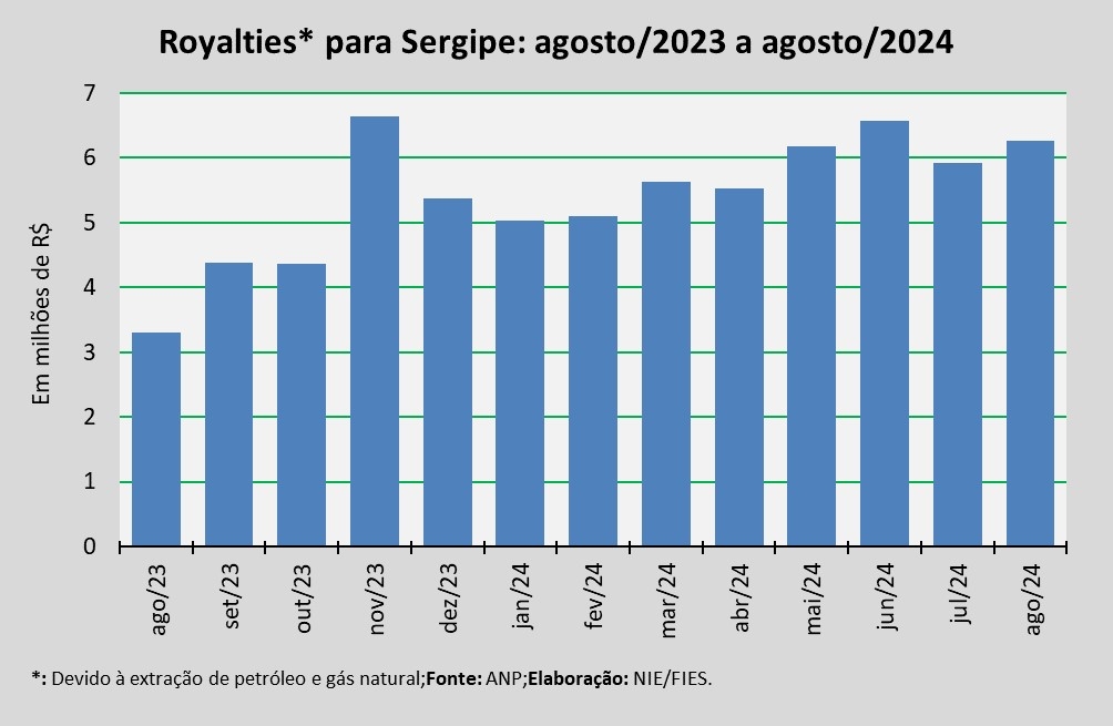 Os royalties creditados ao estado de Sergipe de janeiro a agosto de 2024 acumularam aproximadamente R$ 46,2 milhões. O montante acumulado no ano, até o momento, foi 72,1% maior que o acumulado no mesmo período de 2023, em termos nominais.
