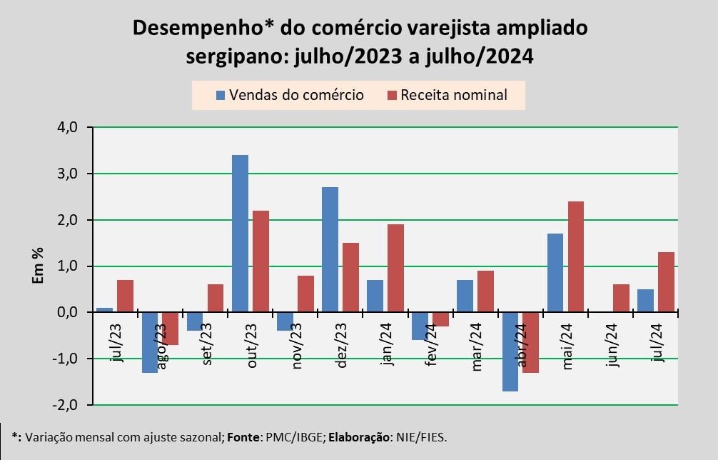 Análise realizada pelo Núcleo de Informações Econômicas da Federação das Indústrias do Estado de Sergipe (FIES), com base nos dados da Pesquisa Mensal do Comércio (PMC) do IBGE, apontou que as vendas do comércio varejista ampliado sergipano aumentaram 0,5%, em julho de 2024, em relação ao mês imediatamente anterior, na série com ajuste sazonal (método que uniformiza os períodos de comparação). No comparativo com julho de 2023, observou-se acréscimo de 8,8%. Já no acumulado dos últimos doze meses, o crescimento registrado foi de 5,7%.