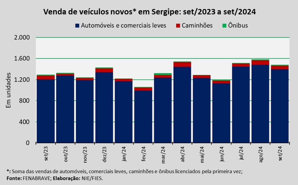 No acumulado dos nove primeiros meses de 2024, as vendas de veículos novos em Sergipe totalizaram aproximadamente 12,2 mil unidades, assinalando acréscimo de 17,3% em relação ao mesmo período de 2023.