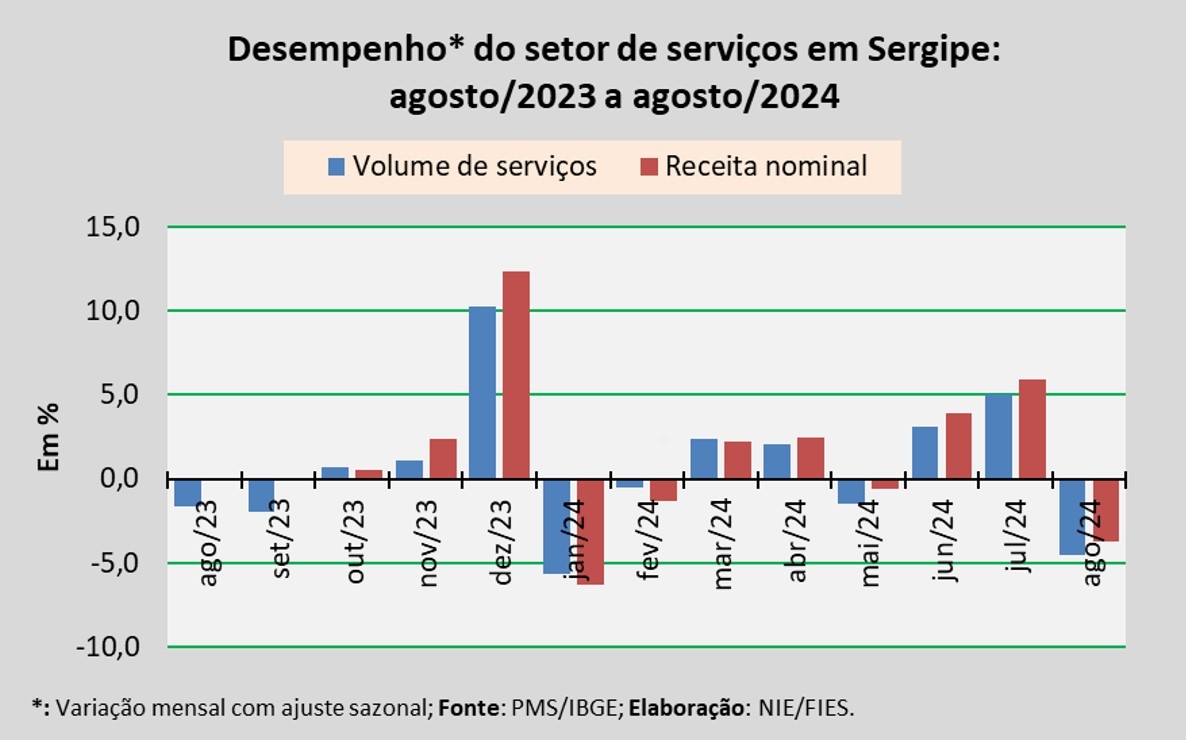 Análise realizada pelo Núcleo de Informações Econômicas da Federação das Indústrias do Estado de Sergipe (FIES), com base nos dados da Pesquisa Mensal de Serviços (PMS) do IBGE, revelou que, em agosto, o setor de serviços em Sergipe apresentou redução de 4,5% no volume de serviços prestados, em relação ao último mês de julho, na série com ajuste sazonal (método utilizado para uniformizar os períodos de comparação). Na comparação com agosto de 2023, o volume de serviços assinalou crescimento de 10,0%. Já no acumulado dos últimos doze meses, foi registrado crescimento de 4,3%.