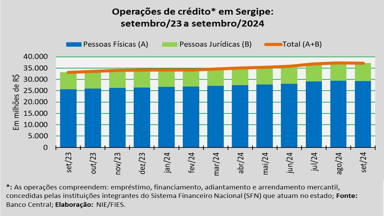 Análise realizada pelo Núcleo de Informações Econômicas da Federação das Indústrias do Estado de Sergipe (FIES), com base nos dados do Banco Central, revelou que o saldo total das operações de crédito em Sergipe somou cerca de R$ 37,2 bilhões, em setembro de 2024.