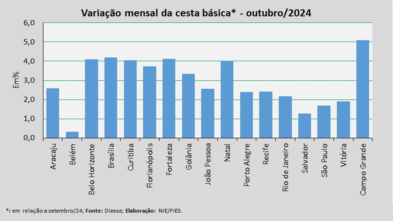 No mês analisado, levando-se em consideração a comparação com o mês anterior (setembro/2024), observou-se aumento no valor da cesta básica em todas as 17 capitais pesquisadas, com destaque para Campo Grande (+5,10%), Brasília (+4,18%) e Fortaleza (+4,13%).