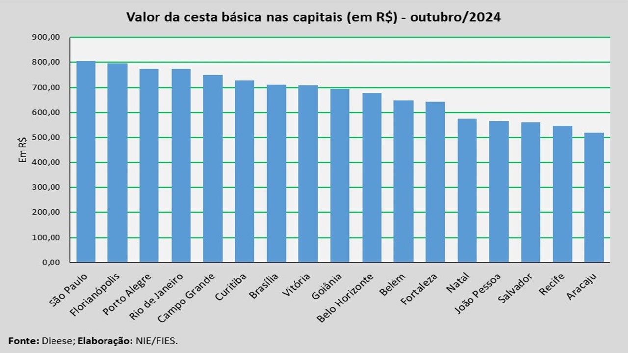 Em termos absolutos, a capital com a cesta mais cara, no mês analisado, foi São Paulo (R$ 805,84), seguida por Florianópolis (R$ 796,94) e Porto Alegre (R$ 774,32). Já as capitais com as cestas mais baratas foram Aracaju (R$ 519,31), seguida por Recife (R$ 548,19) e Salvador (R$ 560,65).