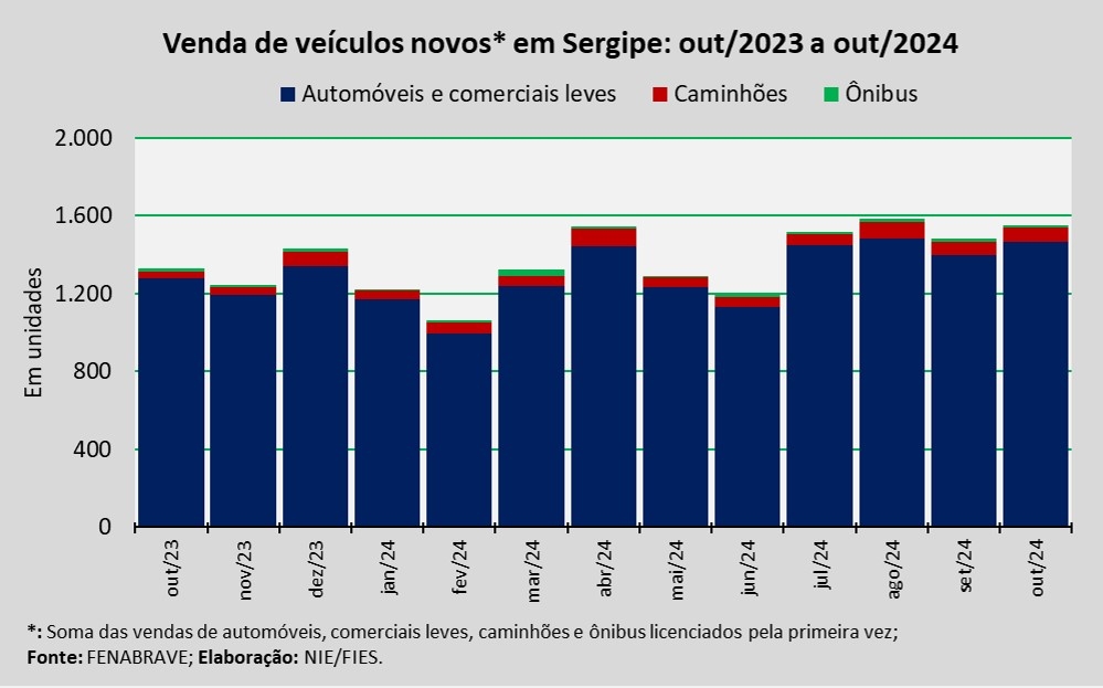 No acumulado dos dez primeiros meses de 2024, as vendas de veículos novos em Sergipe totalizaram aproximadamente 13,8 mil unidades, assinalando acréscimo de 17,2% em relação ao mesmo período de 2023.