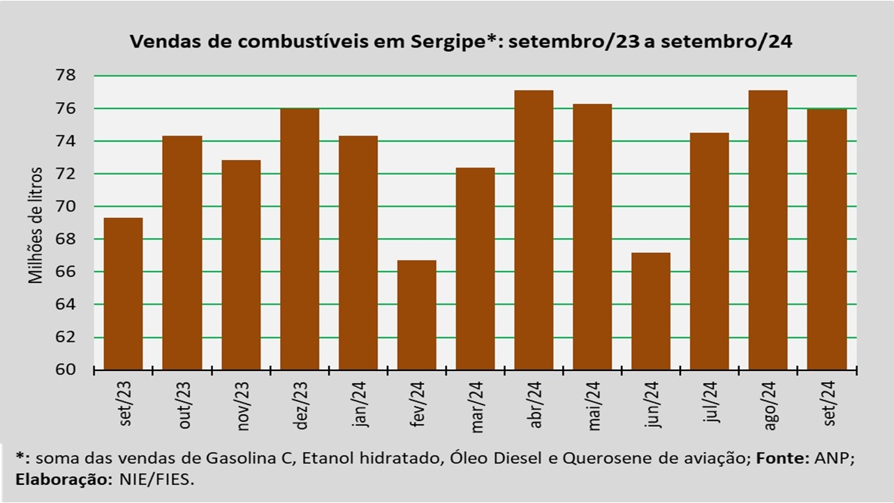 Análise realizada pelo Núcleo de Informações Econômicas da Federação das Indústrias do Estado de Sergipe (FIES), com base nos dados da Agência Nacional do Petróleo, Gás Natural e Biocombustíveis (ANP), indicou que as vendas totais de combustíveis em Sergipe, em setembro de 2024, totalizaram cerca de 75,9 milhões de litros, assinalando um acréscimo de 9,6% quando comparado a setembro de 2023. Em relação ao mês imediatamente anterior (agosto/2024), as vendas diminuíram 1,5%.