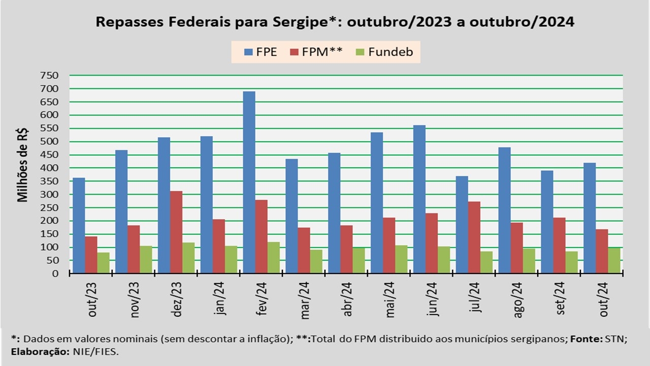 Análise realizada pelo Núcleo de Informações Econômicas da Federação das Indústrias do Estado de Sergipe (FIES), com base nos dados da Secretaria do Tesouro Nacional (STN), indicou que o repasse do Fundo de Participação dos Estados (FPE) para Sergipe, em outubro do ano corrente, foi cerca de R$ 419,1 milhões.