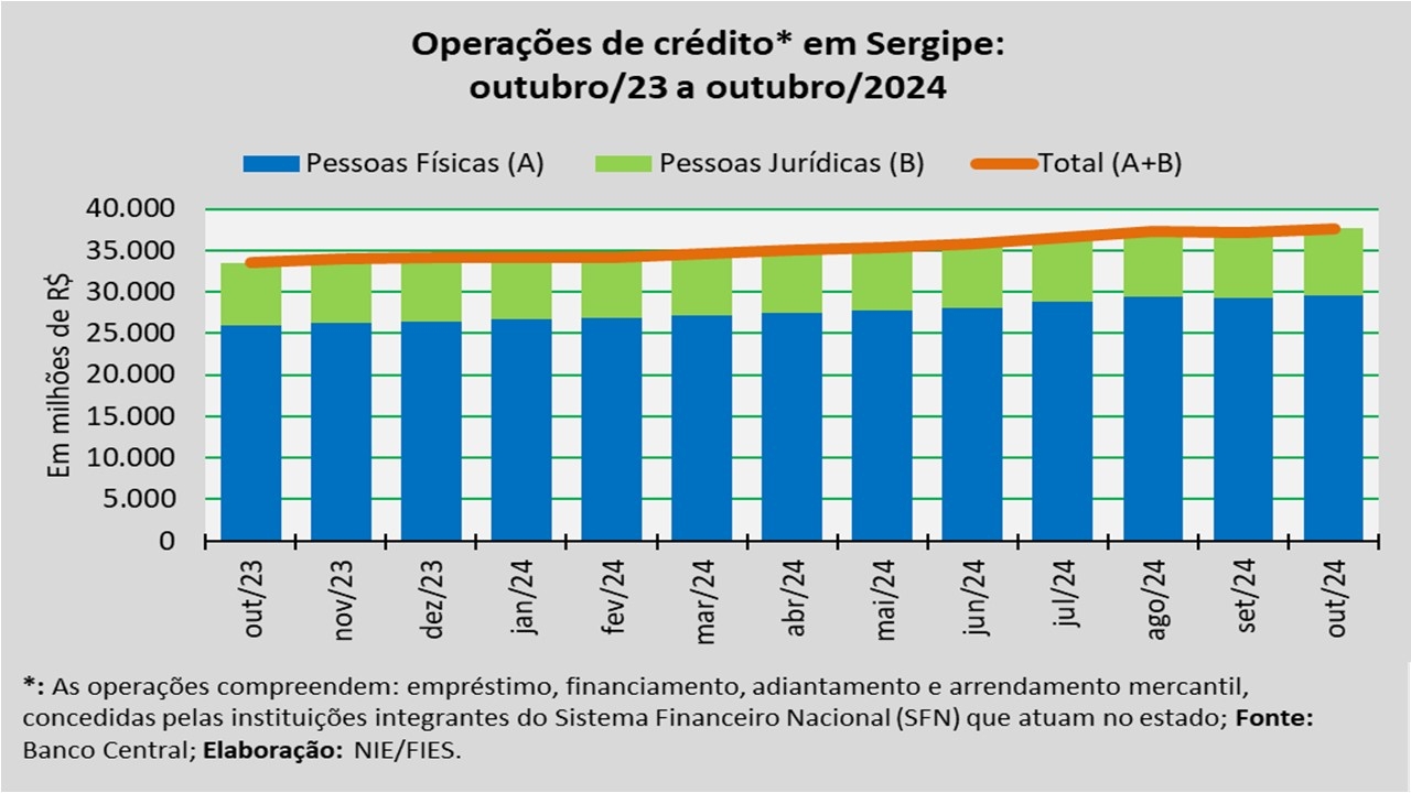 Análise realizada pelo Núcleo de Informações Econômicas da Federação das Indústrias do Estado de Sergipe (FIES), com base nos dados do Banco Central, revelou que o saldo total das operações de crédito em Sergipe somou cerca de R$ 37,6 bilhões, em outubro de 2024.