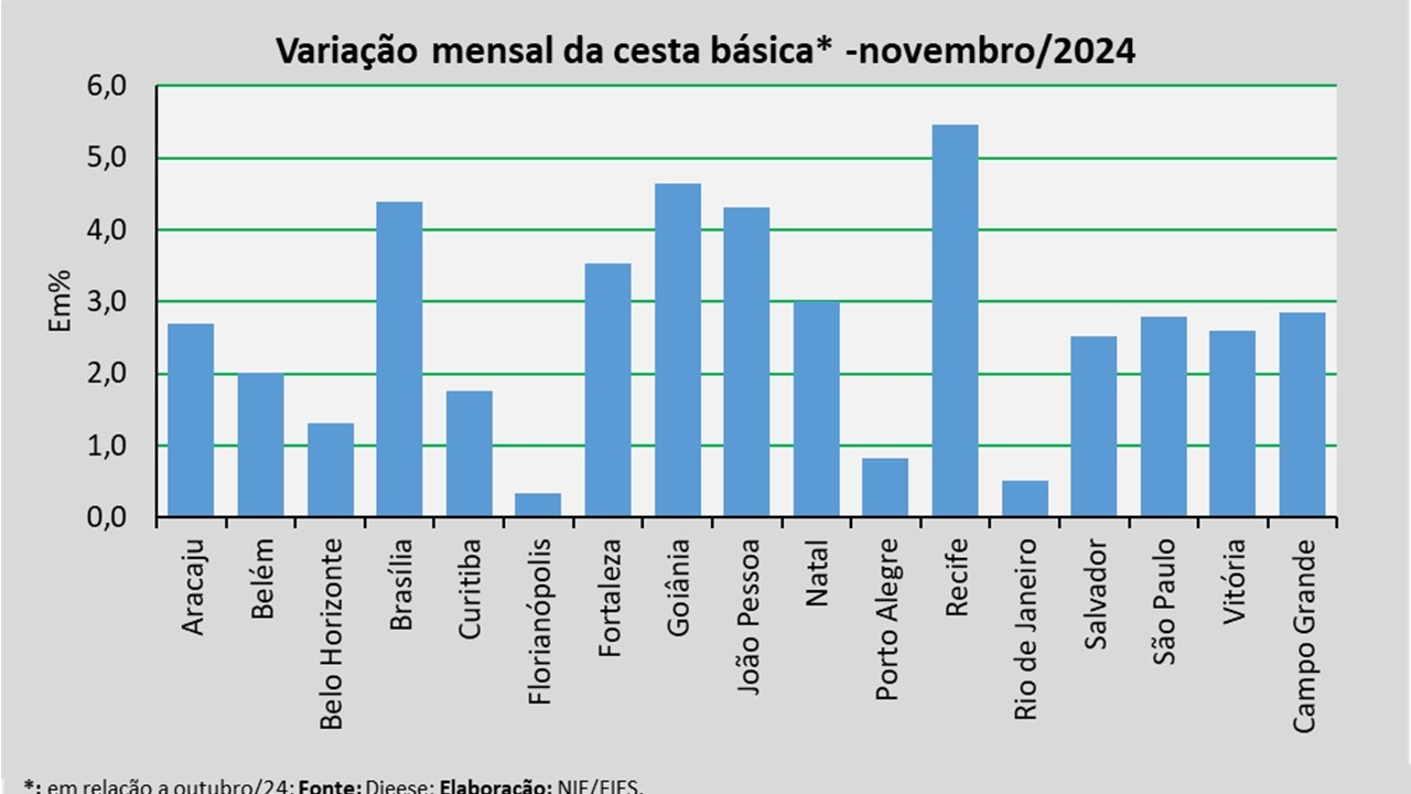 No mês analisado, levando-se em consideração a comparação com o mês anterior (outubro/2024), observou-se aumento no valor da cesta básica em todas as 17 capitais pesquisadas, com destaque para Recife (+5,47%), Goiânia (+4,64%) e Brasília (+4,39%).