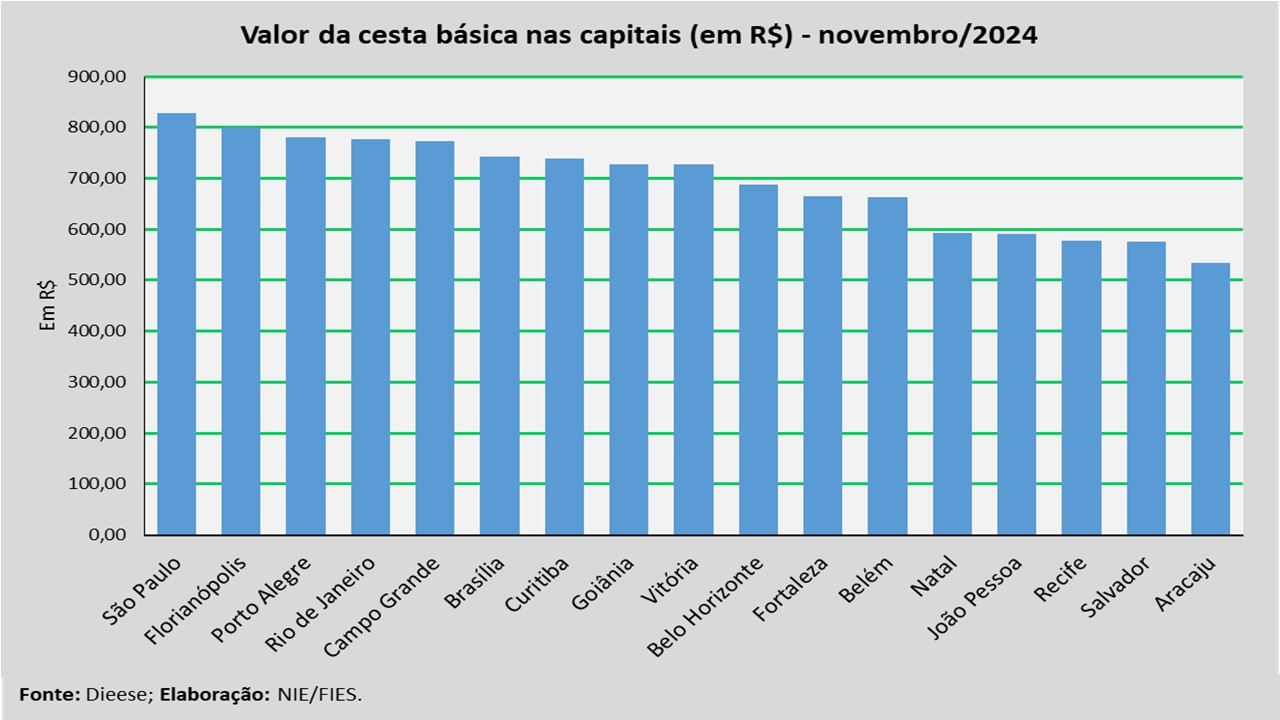 Em termos absolutos, a capital com a cesta mais cara, no mês analisado, foi São Paulo (R$ 828,39), seguida por Florianópolis (R$ 799,62) e Porto Alegre (R$ 780,71). Já as capitais com as cestas mais baratas foram Aracaju (R$ 533,26), seguida por Salvador (R$ 574,78) e Recife (R$ 578,16).