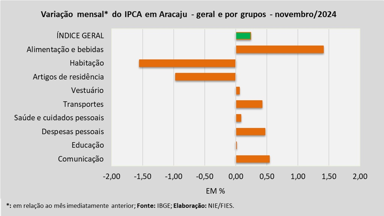 Análise realizada pelo Núcleo de Informações Econômicas da Federação das Indústrias do Estado de Sergipe (FIES), com base nos dados do Instituto Brasileiro de Geografia e Estatística (IBGE), revelou que, em novembro deste ano, a capital sergipana teve inflação de 0,24%, medida pelo Índice de Preços ao Consumidor Amplo – IPCA. Com o resultado de novembro, a inflação acumulada no ano de 2024 chegou a 4,12%.