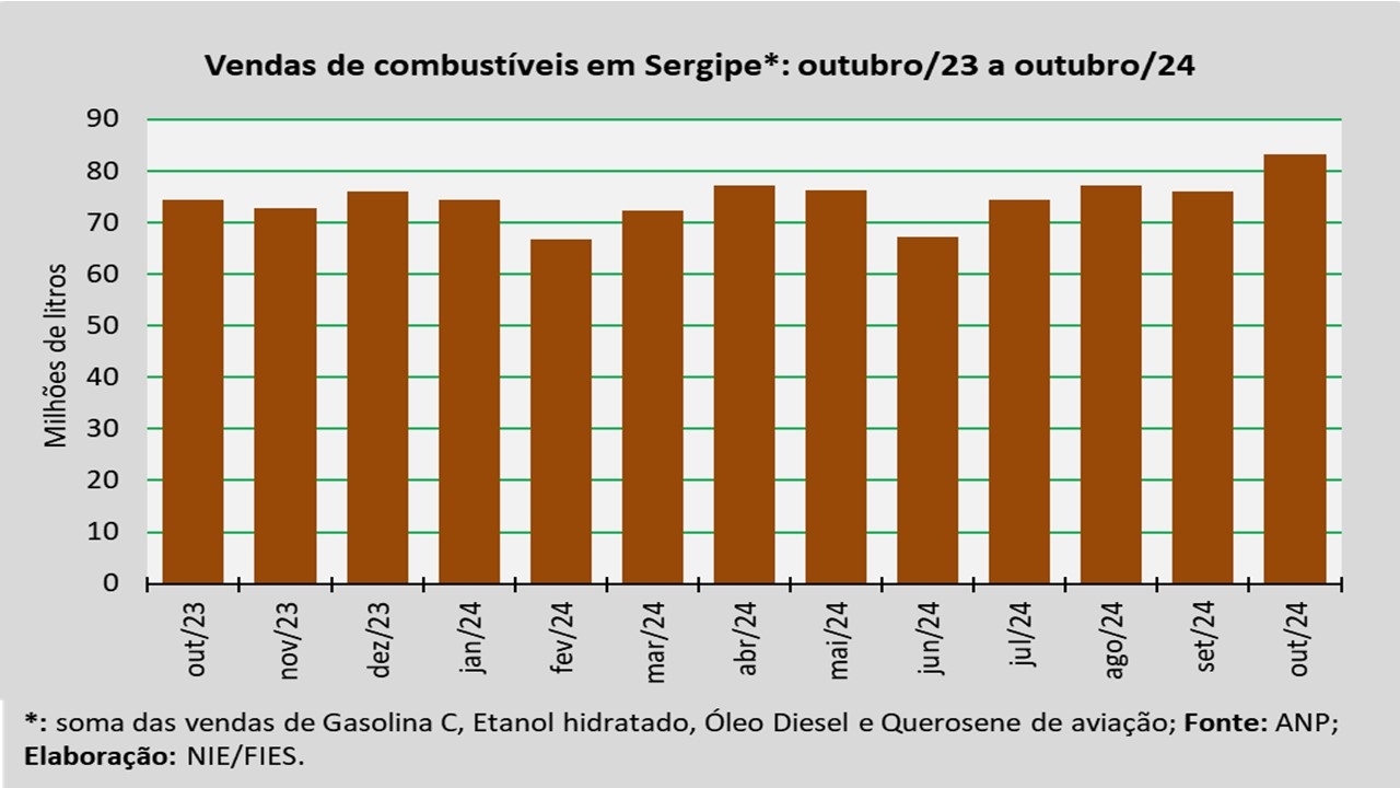 Análise realizada pelo Núcleo de Informações Econômicas da Federação das Indústrias do Estado de Sergipe (FIES), com base nos dados da Agência Nacional do Petróleo, Gás Natural e Biocombustíveis (ANP), indicou que as vendas totais de combustíveis em Sergipe, em outubro de 2024, totalizaram cerca de 83,1 milhões de litros, assinalando um acréscimo de 11,9% quando comparado a outubro de 2023. Em relação ao mês imediatamente anterior (setembro/2024), as vendas aumentaram 9,4%.