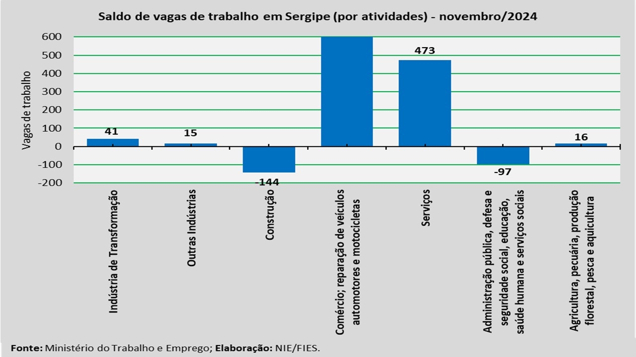 Análise realizada pelo Núcleo de Informações Econômicas da Federação das Indústrias do Estado de Sergipe (FIES), com base nos dados do Novo Cadastro Geral de empregados e desempregados (Caged) do Ministério do Trabalho e Emprego, revelou que houve saldo positivo de 1.502 vagas de emprego com carteira assinada no estado, em novembro deste ano. O saldo decorre da diferença entre 11.089 admissões e 9.587 desligamentos, no período analisado.
