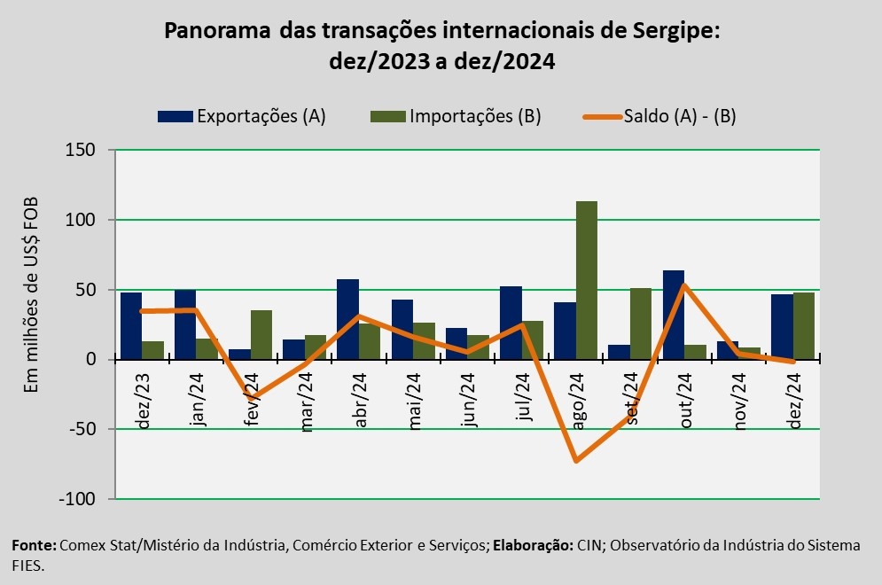 Análise realizada pelo Centro Internacional de Negócios – CIN/SE, da Federação das Indústrias do Estado de Sergipe (FIES), com base nos dados do Comex Stat, sistema para consultas e extração de dados do comércio exterior brasileiro, disponibilizado pelo Mistério da Indústria, Comércio Exterior e Serviços, apontou que as exportações sergipanas, em dezembro de 2024, totalizaram cerca de US$ 46,6 milhões. O montante registrado representa um decréscimo de 3,0%, quando comparado a dezembro de 2023. Na comparação com o mês anterior, novembro último, houve aumento de 256,0%.