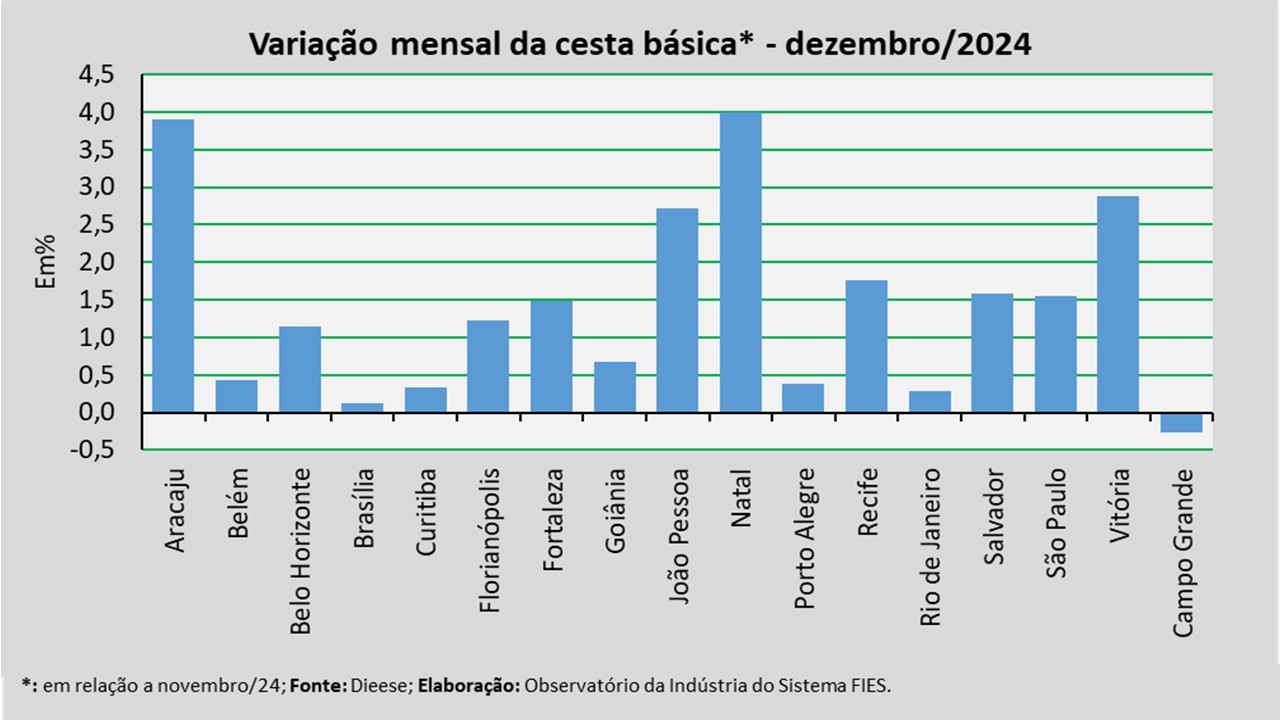 Na comparação com novembro de 2024, verificou-se aumento no valor da cesta em 16 das 17 capitais pesquisadas. Os aumentos mais expressivos na cesta de conjuntos essenciais ocorreram em Natal (4,01%), Aracaju (3,90%) e Vitória (2,88%). Apenas Campo Grande (-0,27%) registrou redução no valor da cesta básica no período analisado.![]()