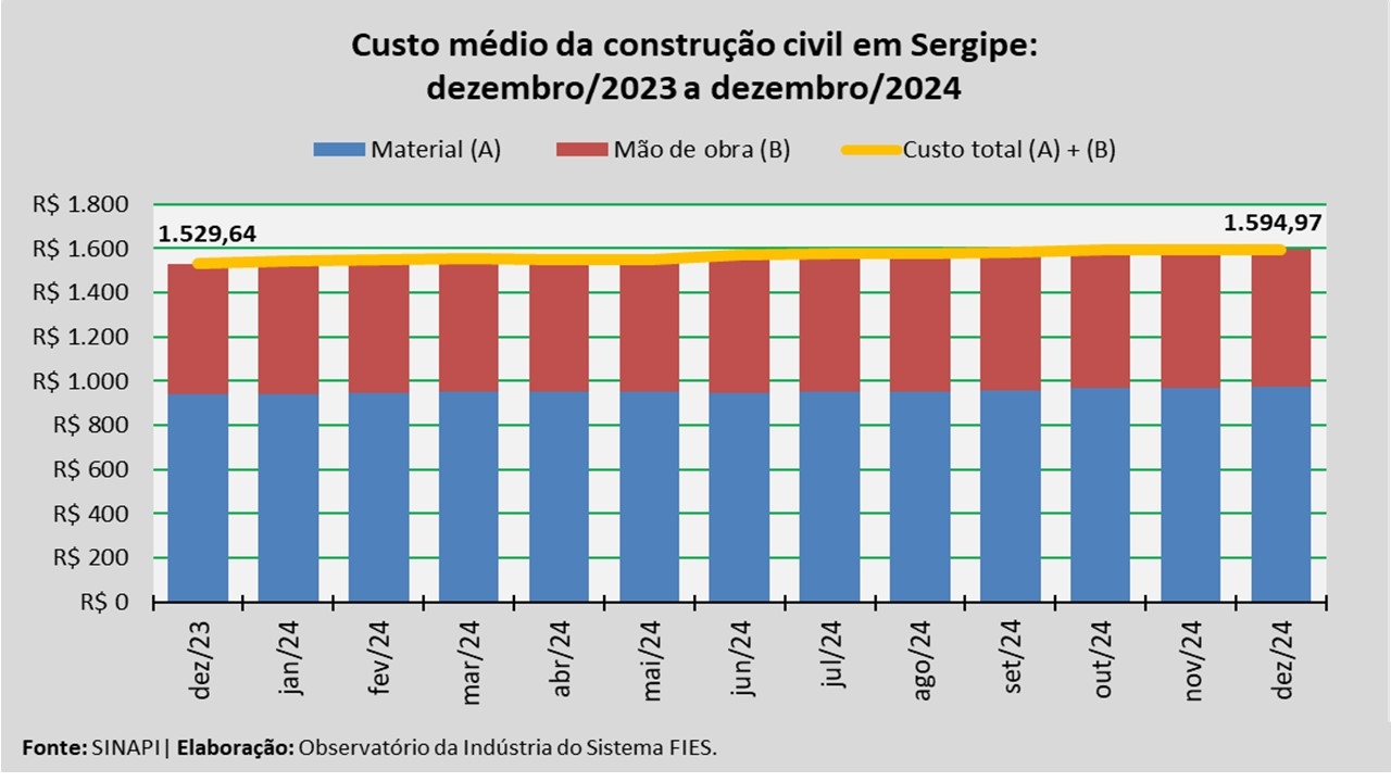 Análise realizada pelo Observatório da Indústria do Sistema FIES, com base nos dados do Sistema Nacional de Pesquisa de Custos e Índices da Construção Civil – SINAPI, uma produção conjunta do IBGE e da Caixa Econômica Federal, revelou que o custo médio da construção em Sergipe, por metro quadrado (m²), em dezembro de 2024, registrou aumento de 0,1%, quando comparado com o mês imediatamente anterior, novembro último. No acumulado do ano que findou, o custo registrado apresentou aumento de 4,3%.