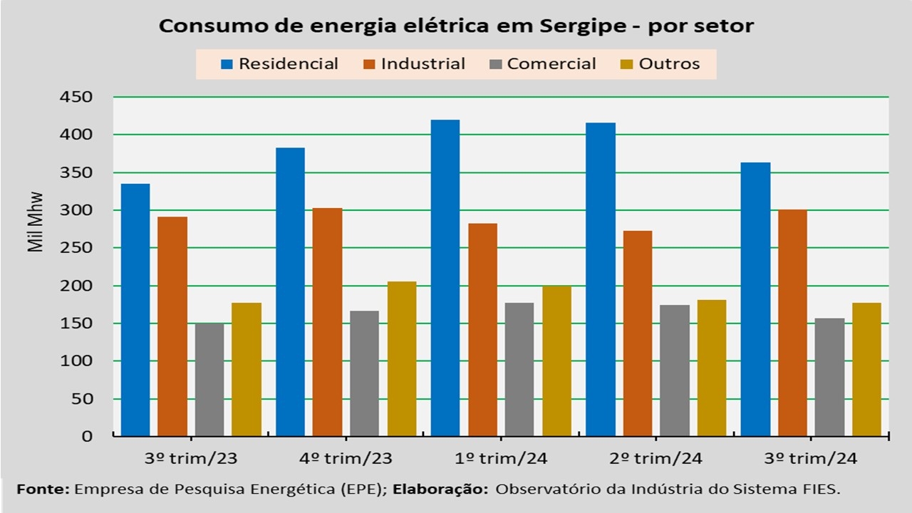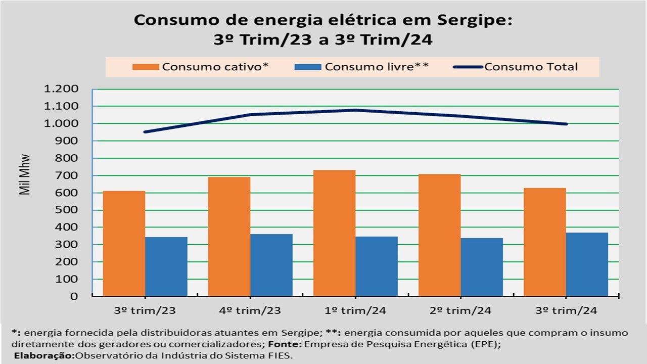 Da quantidade total de energia consumida no terceiro trimestre de 2024, 63,0% (ou cerca de 628,6 mil MWh) foi proveniente do mercado cativo. Nesse mercado, a energia é fornecida exclusivamente pelas distribuidoras instaladas em Sergipe, com o preço e as demais condições de fornecimento reguladas pela Agência Nacional de Energia Elétrica (ANEEL).