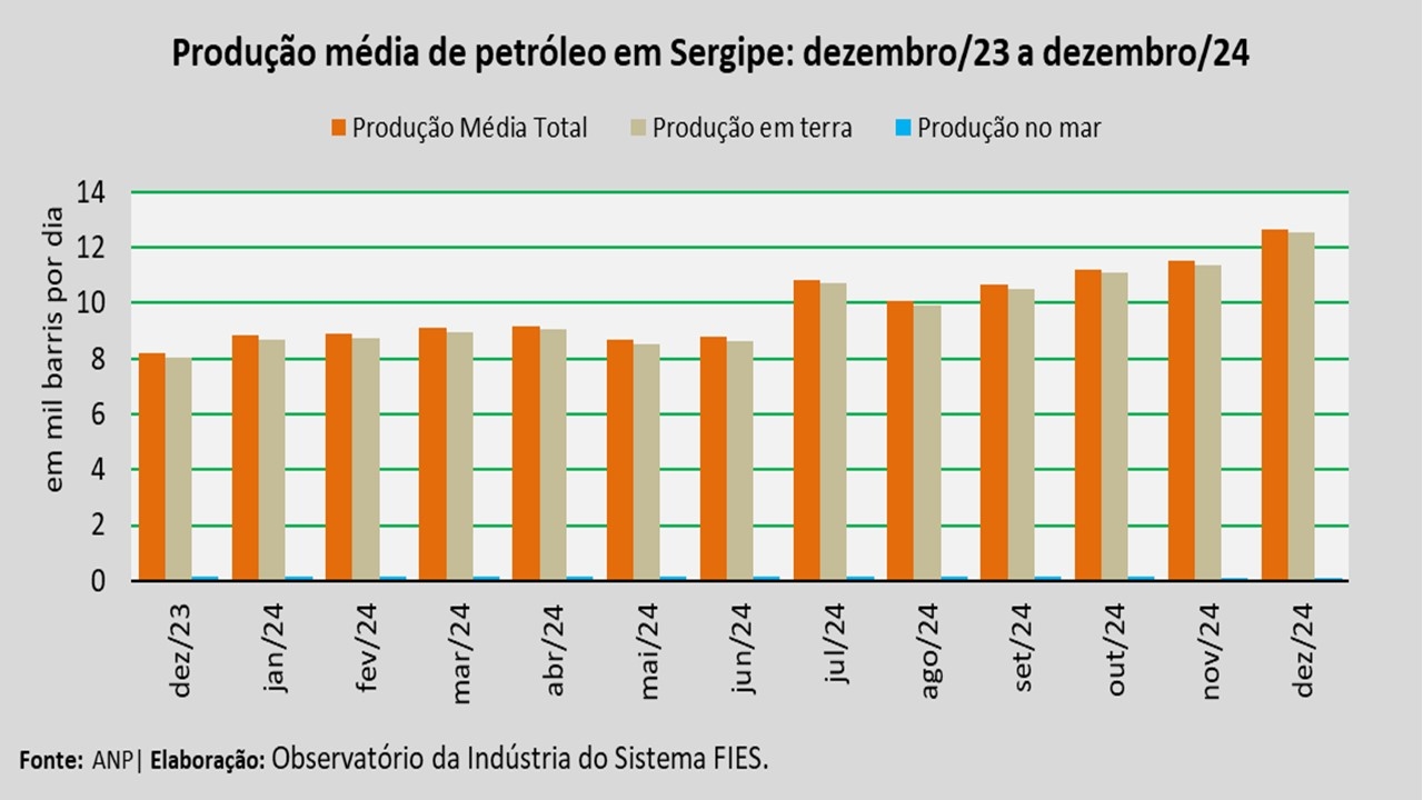 Análise realizada pelo Observatório da Indústria do Sistema FIES, com base nos dados da Agência Nacional do Petróleo, Gás Natural e Biocombustíveis (ANP), revelou que a produção de petróleo no estado, em dezembro de 2024, alcançou, em média, 12,7 mil barris por dia (bpd), registrando um aumento de 10,1% em relação à produção média do mês anterior (novembro/2024). No comparativo com dezembro de 2023, verificou-se um aumento de 54,3%. Com o total produzido em dezembro, a produção acumulada ao longo de 2024 atingiu cerca de 120,4 mil barris, um crescimento de 49,6% no comparativo com 2023.