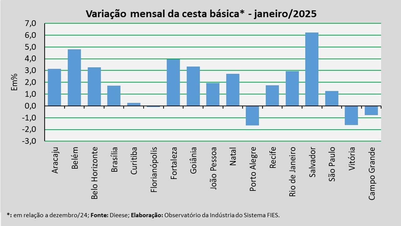 No mês analisado, levando-se em consideração a comparação com o mês anterior (dezembro/2024), observou-se redução no valor da cesta básica, apenas, nas capitais Porto Alegre (-1,67%), Vitória (-1,62%), Campo Grande (-0,79%) e Florianópolis (-0,09%). Nas demais capitais pesquisadas o valor da cesta básica aumentou. Os maiores percentuais de altas foram registrados em Salvador (+6,22%), Belém (+4,80%) e Fortaleza (+3,96%).