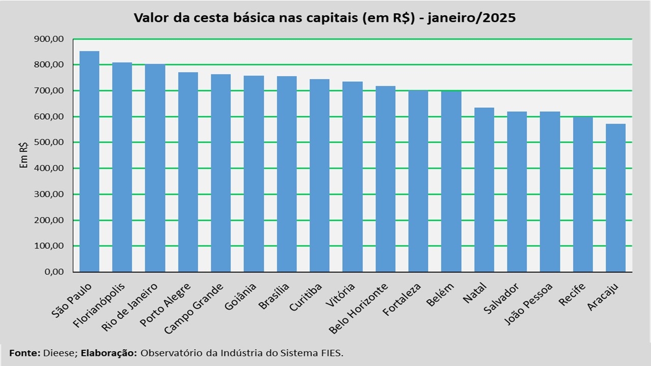 Análise realizada pelo Observatório da Indústria do Sistema FIES, com base nos dados da Pesquisa Nacional da Cesta Básica, realizada pelo Departamento Intersindical de Estatística e Estudos Socioeconômicos (DIEESE), revelou que, em janeiro, o valor médio da cesta básica na capital sergipana ficou em R$ 571,43, o menor custo dentre as capitais pesquisadas.