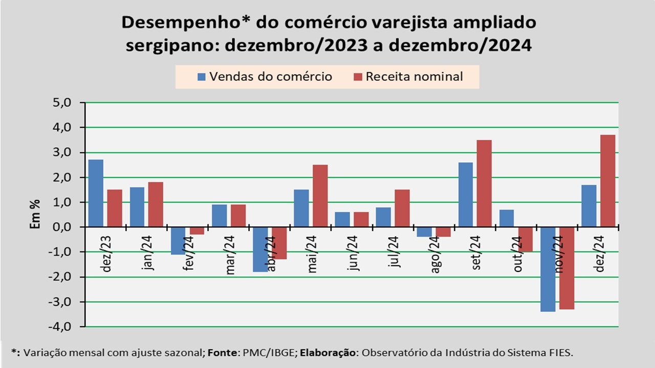 Análise realizada pelo Observatório da Indústria do Sistema FIES, com base nos dados da Pesquisa Mensal do Comércio (PMC) do IBGE, apontou que as vendas do comércio varejista ampliado sergipano, em dezembro de 2024, assinalaram crescimento de 1,7%, em relação ao mês imediatamente anterior (novembro/2024), na série com ajuste sazonal (método que uniformiza os períodos de comparação). No comparativo com dezembro de 2023, observou-se acréscimo de 3,3% e no acumulado de 2024 o crescimento registrado foi de 6,5%, em relação ao ano de 2023.