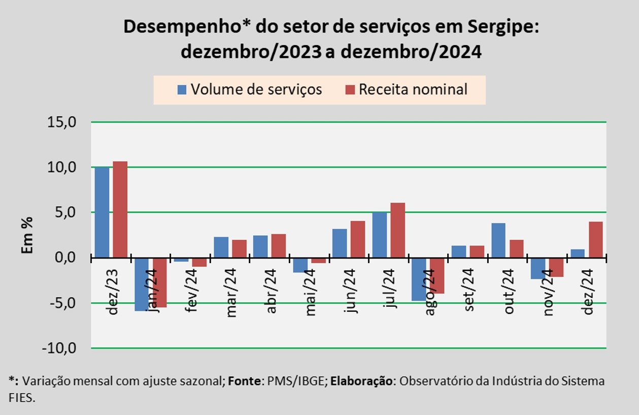 Análise realizada pelo Observatório da Indústria do Sistema FIES, com base nos dados da Pesquisa Mensal de Serviços (PMS) do IBGE, revelou que, em dezembro, o setor de serviços em Sergipe apresentou aumento de 0,9% no volume de serviços prestados, em relação ao último mês de novembro, na série com ajuste sazonal (método utilizado para uniformizar os períodos de comparação). Na comparação com dezembro de 2023, o volume de serviços assinalou crescimento de 3,3%.