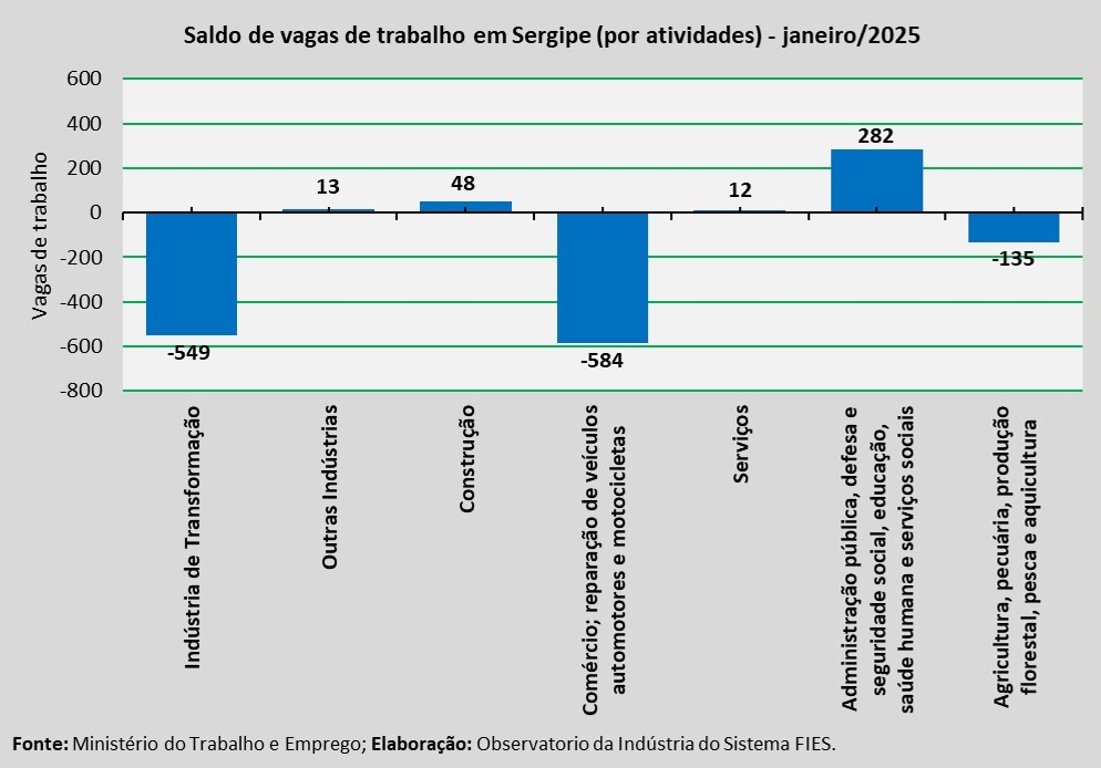 Análise realizada pelo Observatório da Indústria do Sistema FIES, com base nos dados do Novo Cadastro Geral de empregados e desempregados (Caged) do Ministério do Trabalho e Emprego, revelou que houve saldo negativo de 913 vagas de emprego com carteira assinada no estado, em janeiro de 2025. O saldo decorre da diferença entre 11.981 admissões e 12.894 desligamentos, no período analisado.