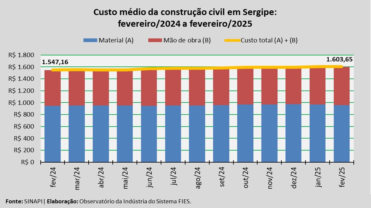 Análise realizada pelo Observatório da Indústria do Sistema FIES, com base nos dados do Sistema Nacional de Pesquisa de Custos e Índices da Construção Civil – SINAPI, uma produção conjunta do IBGE e da Caixa Econômica Federal, revelou que o custo médio da construção em Sergipe, por metro quadrado (m²), em fevereiro deste ano, manteve-se constante, quando comparado com o mês imediatamente anterior, janeiro último. Na comparação com o mês de fevereiro do ano passado, o custo registrado apresentou crescimento de 3,6%. No acumulado do ano, o custo registrado apresentou aumento de 0,5%.