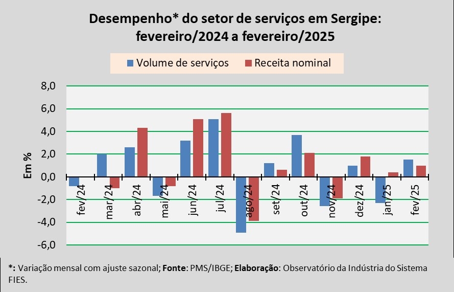 Análise realizada pelo Observatório da Indústria do Sistema FIES, com base nos dados da Pesquisa Mensal de Serviços (PMS) do IBGE, revelou que, em fevereiro, o setor de serviços em Sergipe apresentou aumento de 1,5% no volume de serviços prestados, em relação ao último mês de janeiro, na série com ajuste sazonal (método utilizado para uniformizar os períodos de comparação). Na comparação com fevereiro de 2024, o volume de serviços assinalou crescimento de 11,9%. Já no acumulado dos últimos doze meses, o aumento registrado foi de 7,7%.
