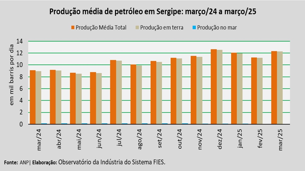Análise realizada pelo Análise realizada pelo Observatório da Indústria do Sistema FIES, com base nos dados da Agência Nacional do Petróleo, Gás Natural e Biocombustíveis (ANP), revelou que a produção de petróleo no estado, no mês de março, alcançou, em média, 12,3 mil barris por dia (bpd), registrando um acréscimo de 9,5% em relação à produção média do mês anterior (fevereiro/2025). No comparativo com março de 2024, verificou-se acréscimo de 35,3%.