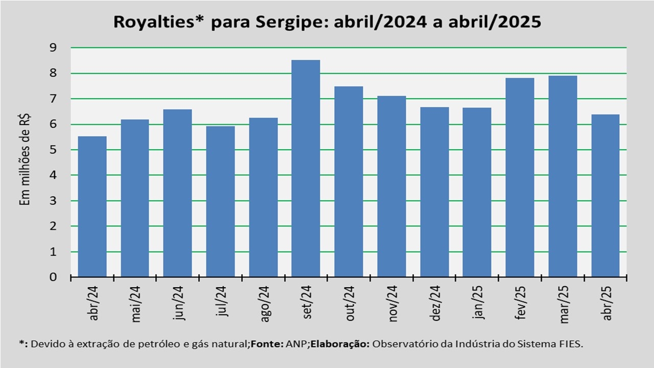 Análise realizada pelo Observatório da Indústria do Sistema FIES, com base nos dados da Agência Nacional do Petróleo, Gás Natural e Biocombustíveis (ANP), revelou que o pagamento de royalties ao Estado de Sergipe, referentes à extração de petróleo e gás natural do mês de fevereiro último, somou cerca de R$ 6,4 milhões. O valor, segundo a ANP, foi creditado em abril.