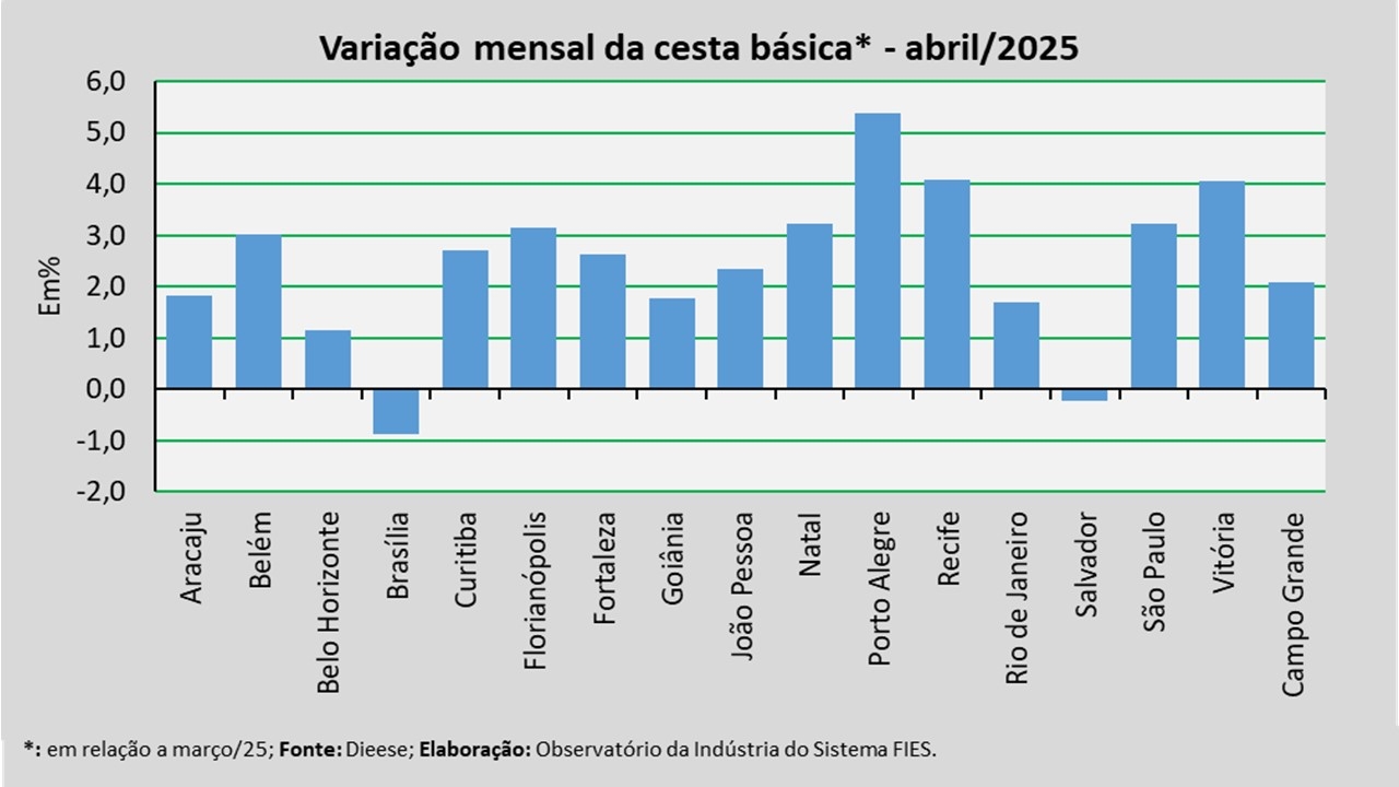 Em relação a abril de 2024, além de Aracaju (-0,37%), somente Salvador (-1,25%) registrou redução no custo da cesta básica. Todas as outras capitais pesquisadas apresentaram aumento. As altas mais significativas foram registradas em São Paulo (+10,50%), Campo Grande (+9,87%) e Florianópolis (+9,81%). ![]()