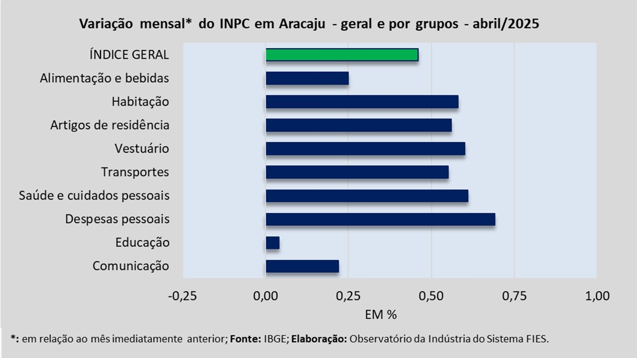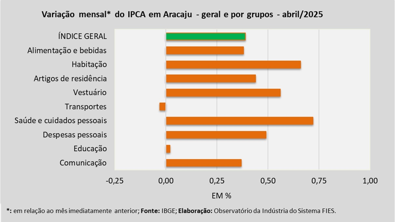 Análise realizada pelo Observatório da Indústria do Sistema FIES, com base nos dados do Instituto Brasileiro de Geografia e Estatística (IBGE), revelou que, em abril deste ano, a capital sergipana registrou inflação de 0,39%, medida pelo Índice de Preços ao Consumidor Amplo – IPCA. Com o resultado de abril, a inflação acumulada no ano de 2025 chegou a 3,06%.