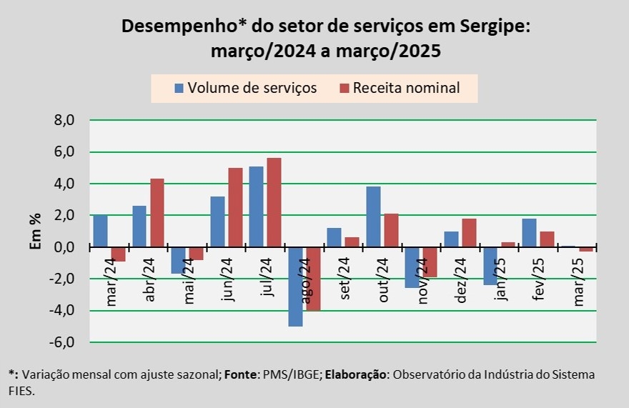 Análise realizada pelo Observatório da Indústria do Sistema FIES, com base nos dados da Pesquisa Mensal de Serviços (PMS) do IBGE, revelou que, em março, o setor de serviços em Sergipe apresentou aumento de 0,1% no volume de serviços prestados, em relação ao último mês de fevereiro, na série com ajuste sazonal (método utilizado para uniformizar os períodos de comparação). Na comparação com março de 2024, o volume de serviços assinalou crescimento de 3,9%. Já no acumulado dos últimos doze meses, o aumento registrado foi de 8,6%.