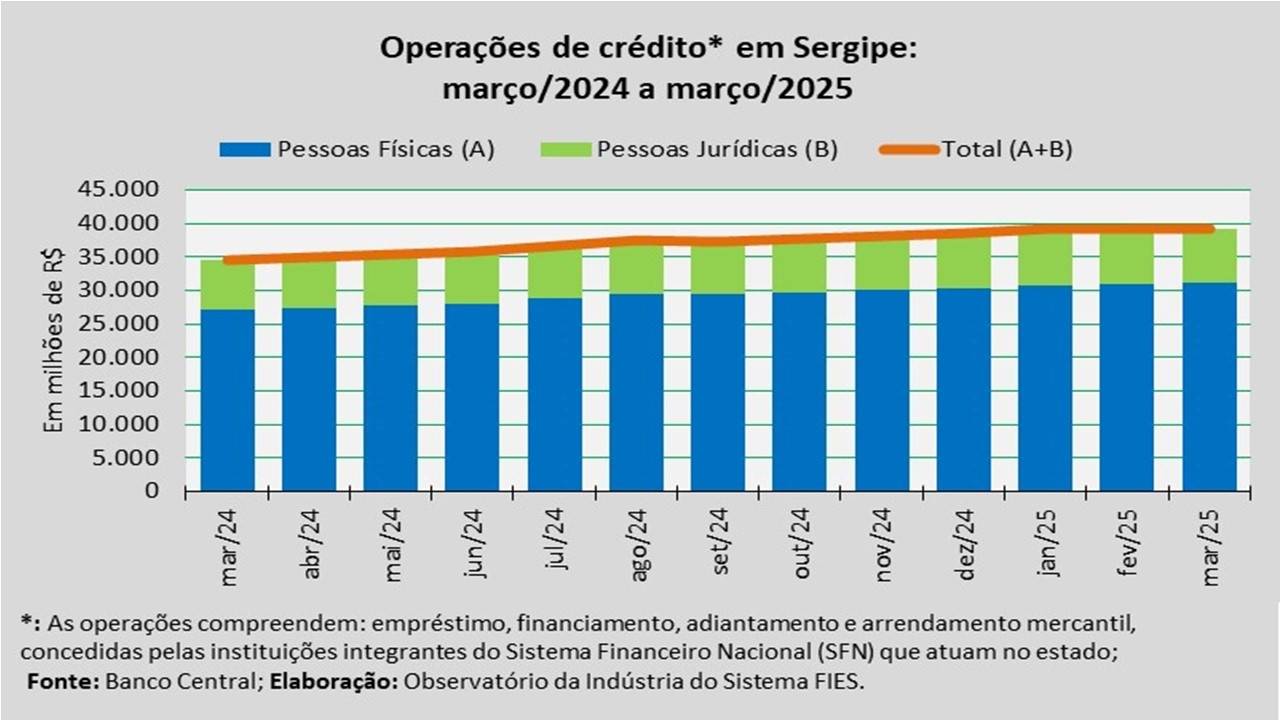 Análise realizada pelo Observatório da Indústria do Sistema FIES, com base nos dados do Banco Central, revelou que o saldo total das operações de crédito em Sergipe totalizou aproximadamente R$ 39,2 bilhões, no mês de março de 2025.