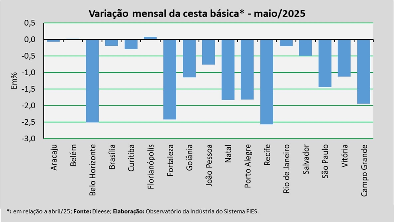No mês analisado, levando-se em consideração a comparação com o mês anterior (abril/2025), observou-se aumento no valor da cesta básica apenas em duas capitais: Florianópolis (+0,09%) e Belém (+0,02%). Nas demais capitais pesquisadas, o valor da cesta diminuiu. Os maiores percentuais de redução foram registrados em Recife (-2,56%), Belo Horizonte (-2,50%) e Fortaleza (-2,42%).